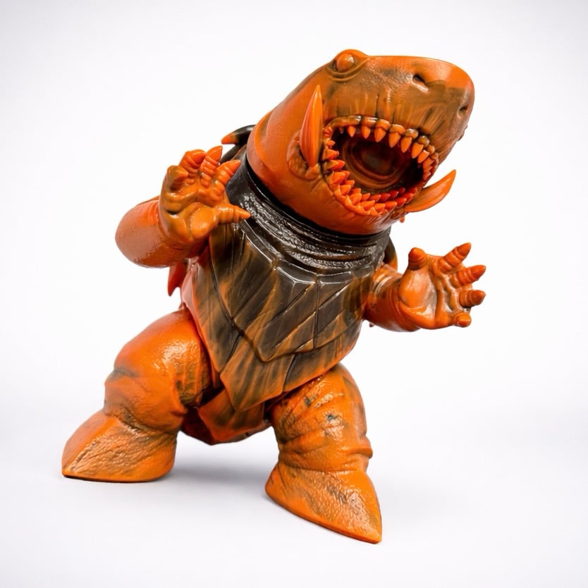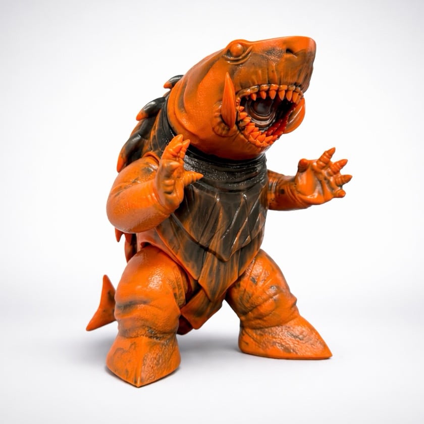 A Spumoni Toys original—Kugora, the Terror of Eden. A hybrid shark and turtle, this 10-inch soft vinyl figure is a unique marble blend, no 2 are alike, and makes a striking addition to any kaiju collection